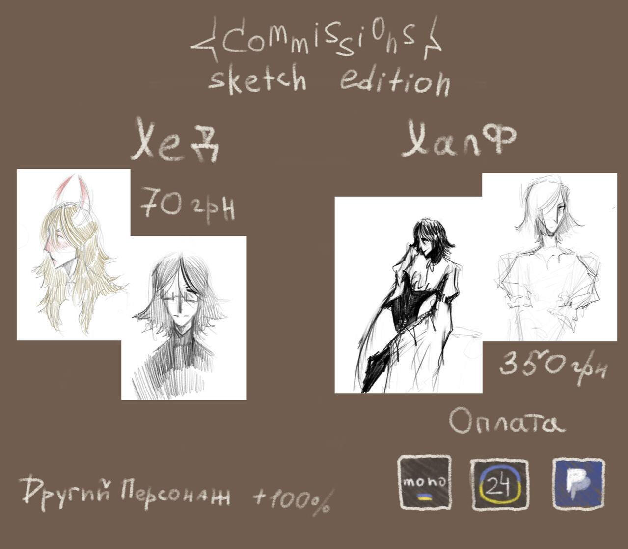 Скетч: портрет 300 грн, по пояс 500 грн, повний 700 грн