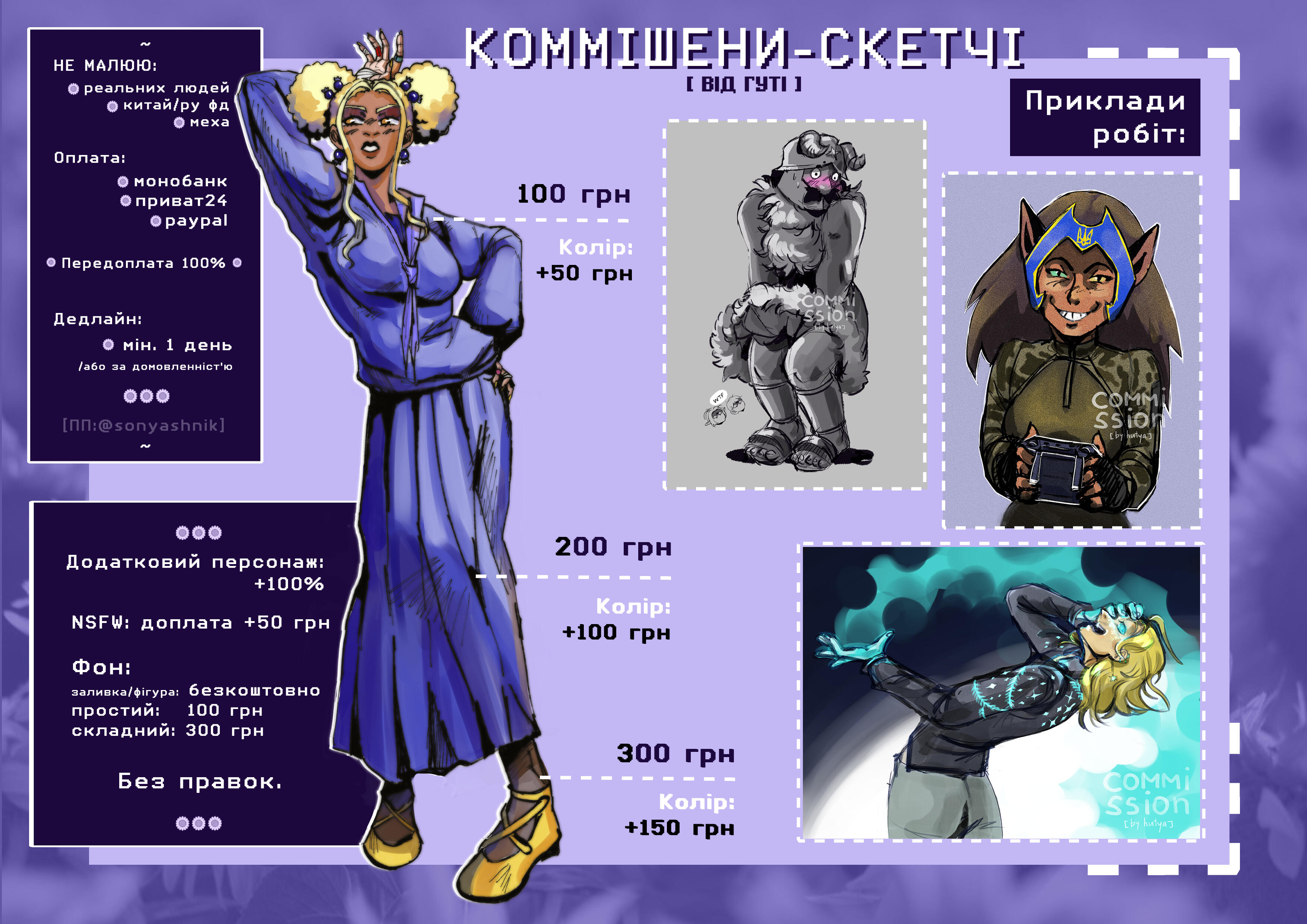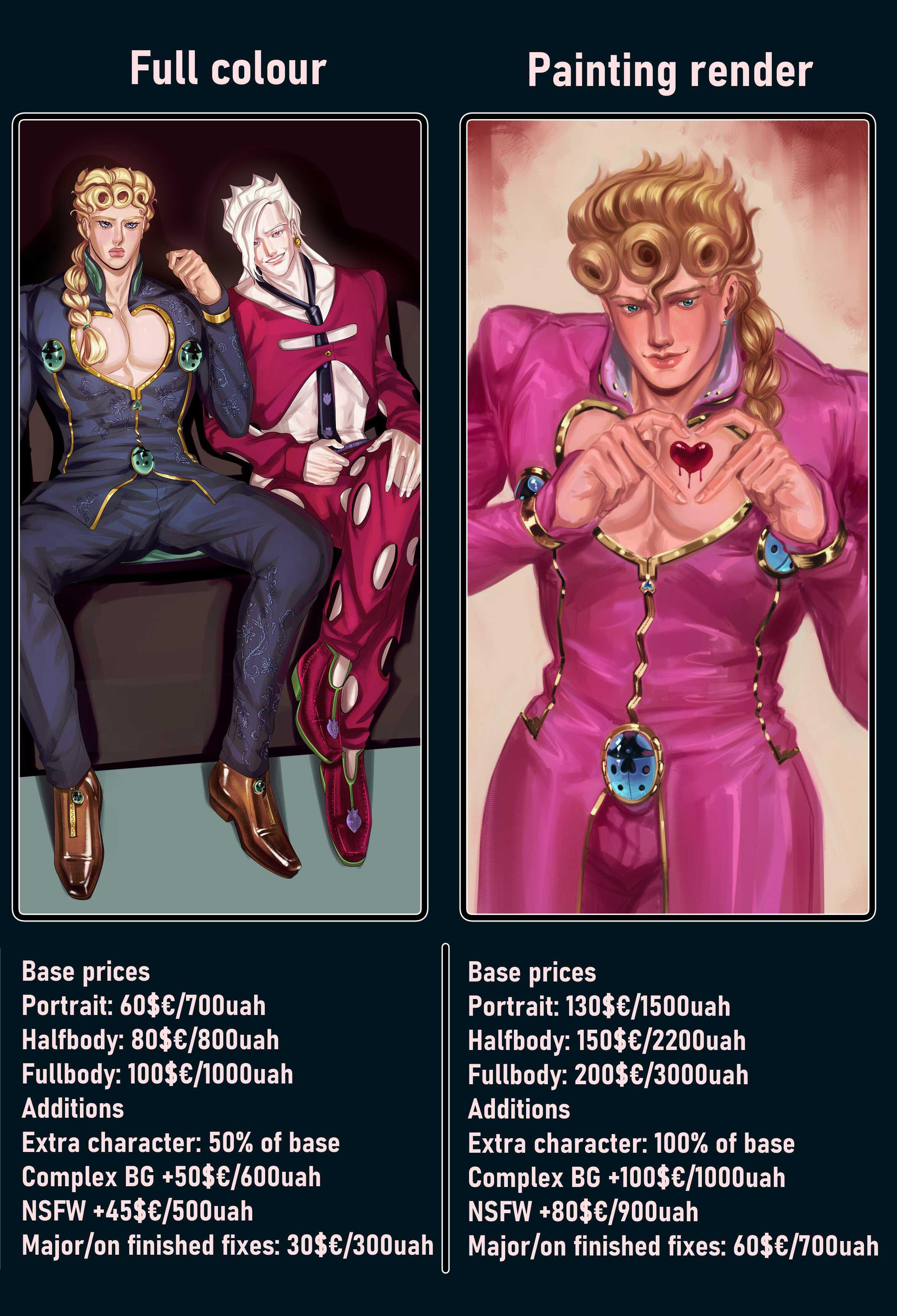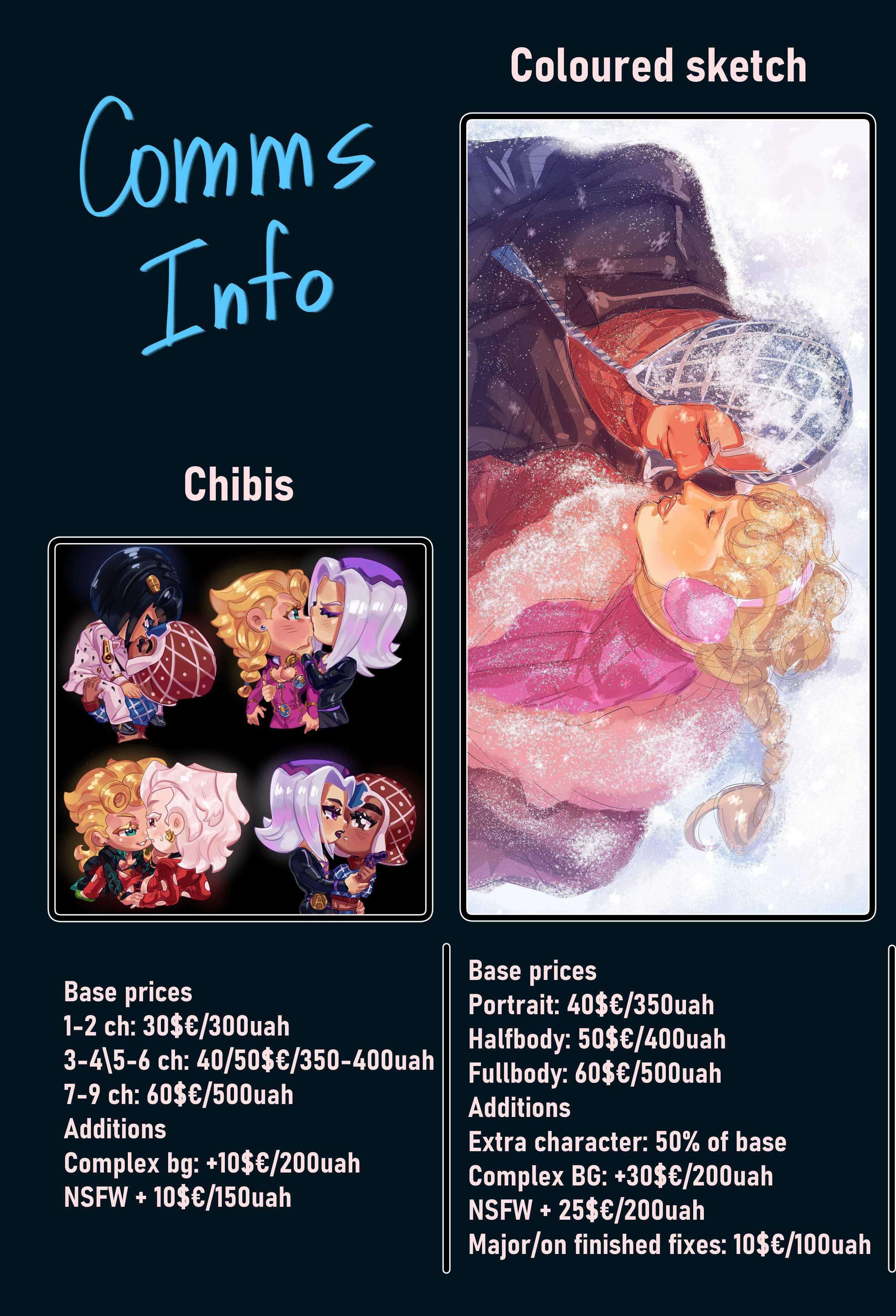 Додатковий персонаж + 400 грн, NSFW + 400 грн, додаткові правки +100 грн