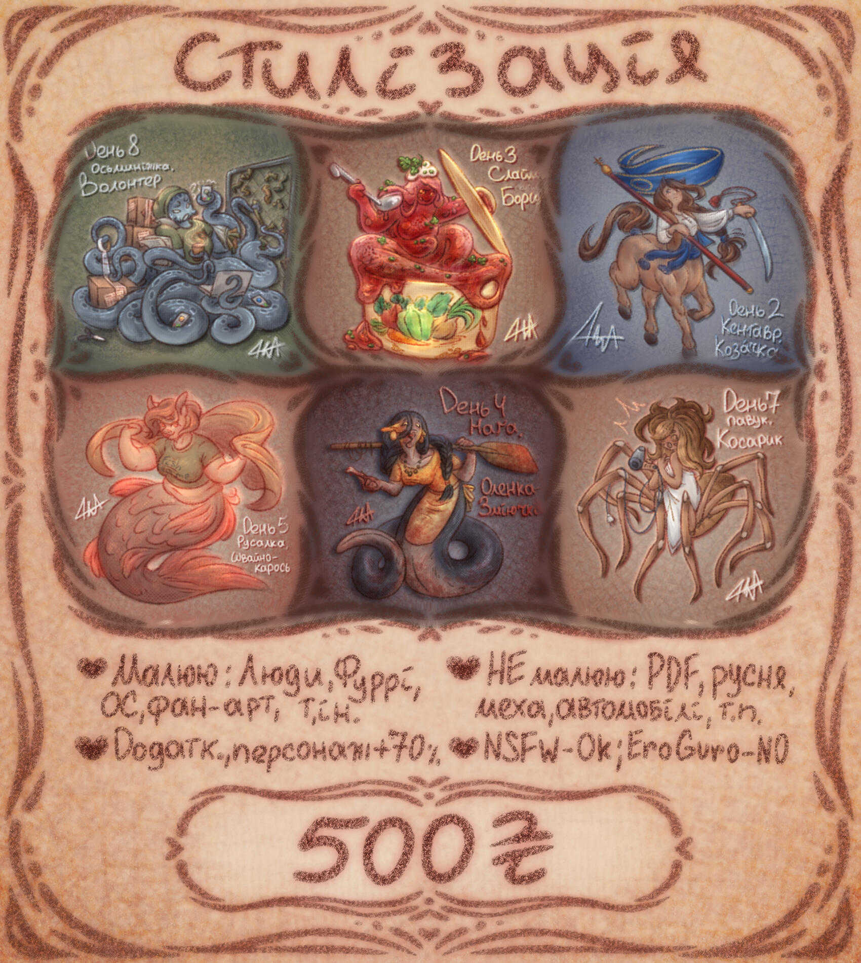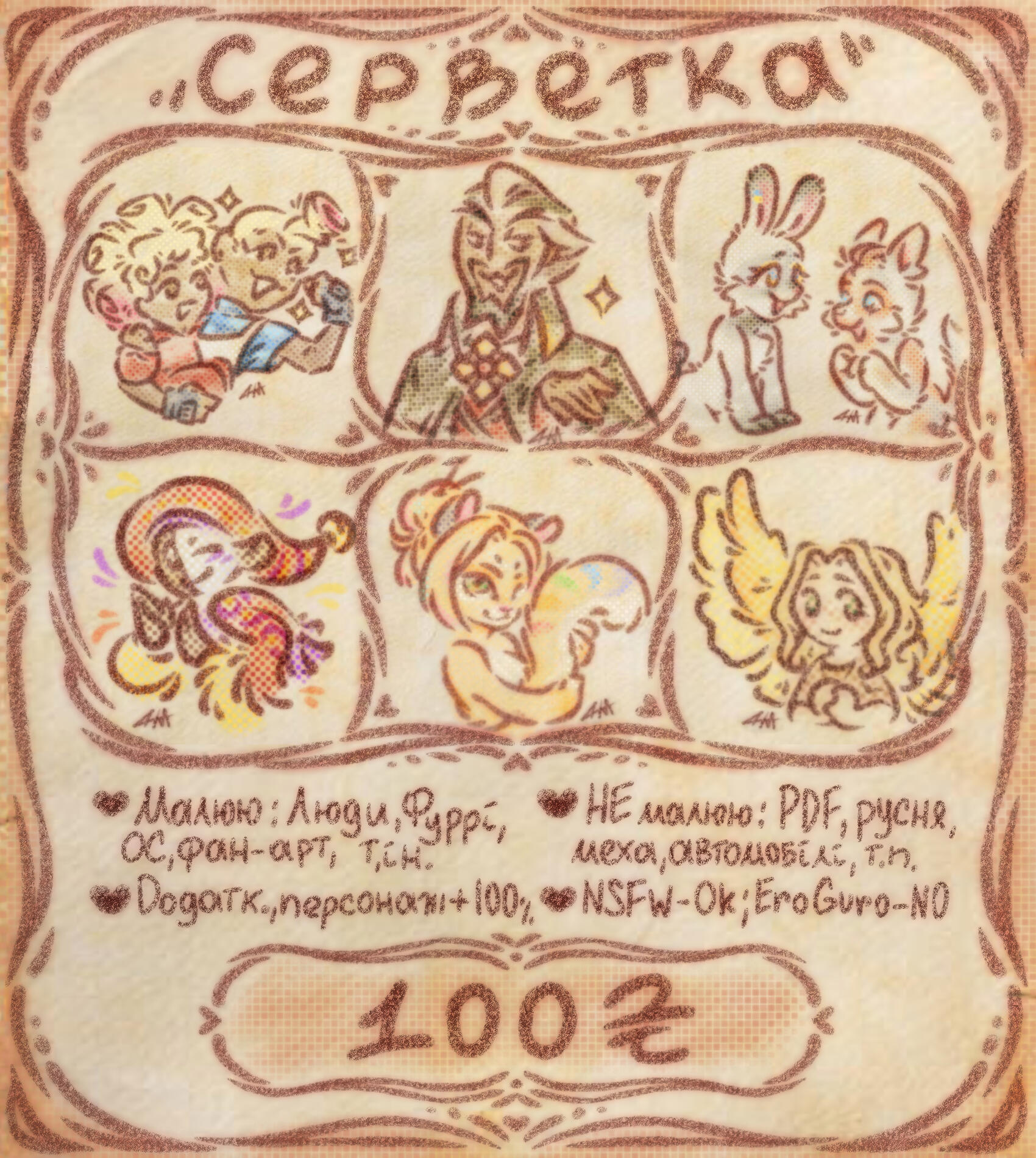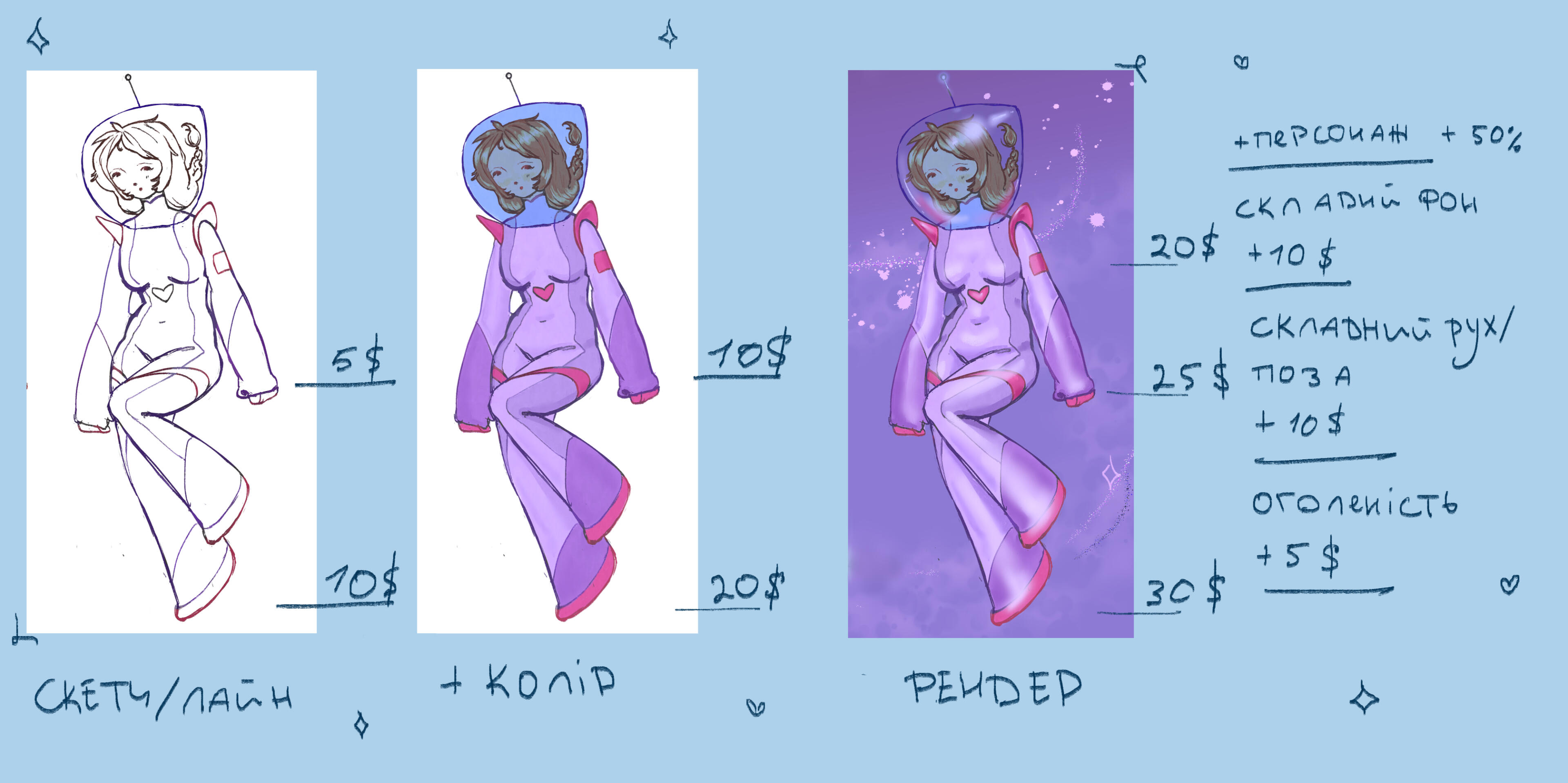 Додатковий персонаж + 400 грн, NSFW + 400 грн, додаткові правки +100 грн