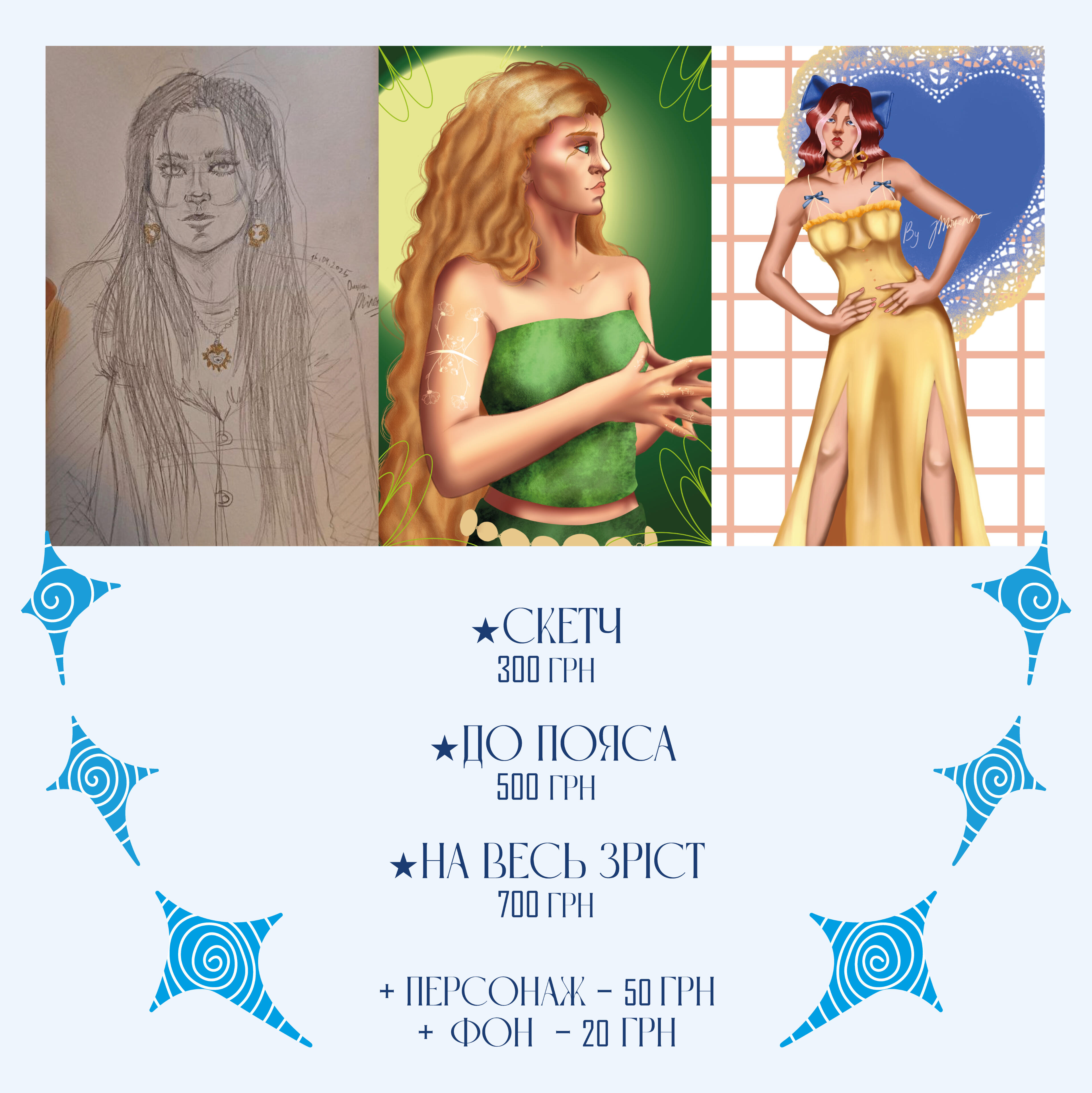 Портрет 300 грн / по пояс 600 грн / повний зріст 900 грн