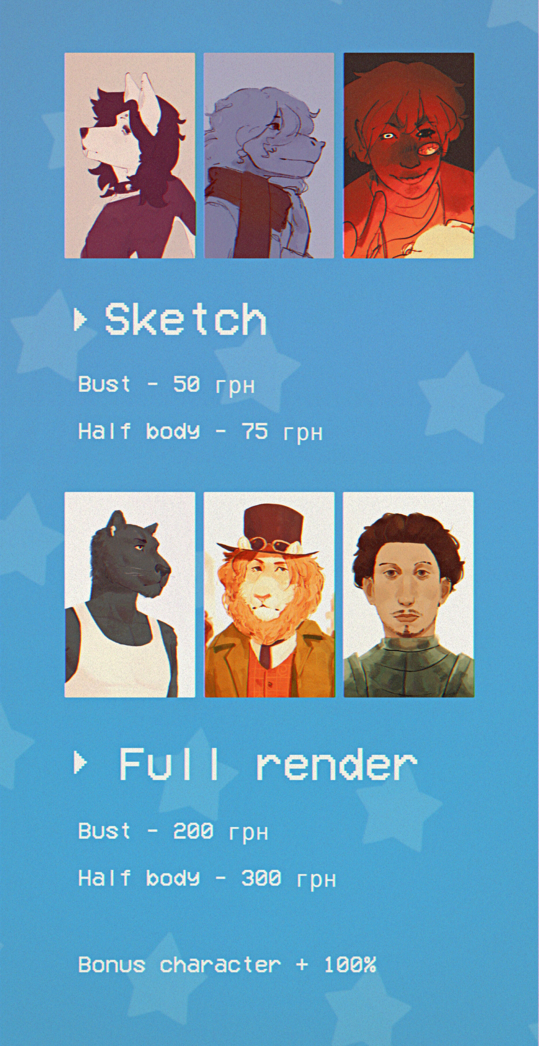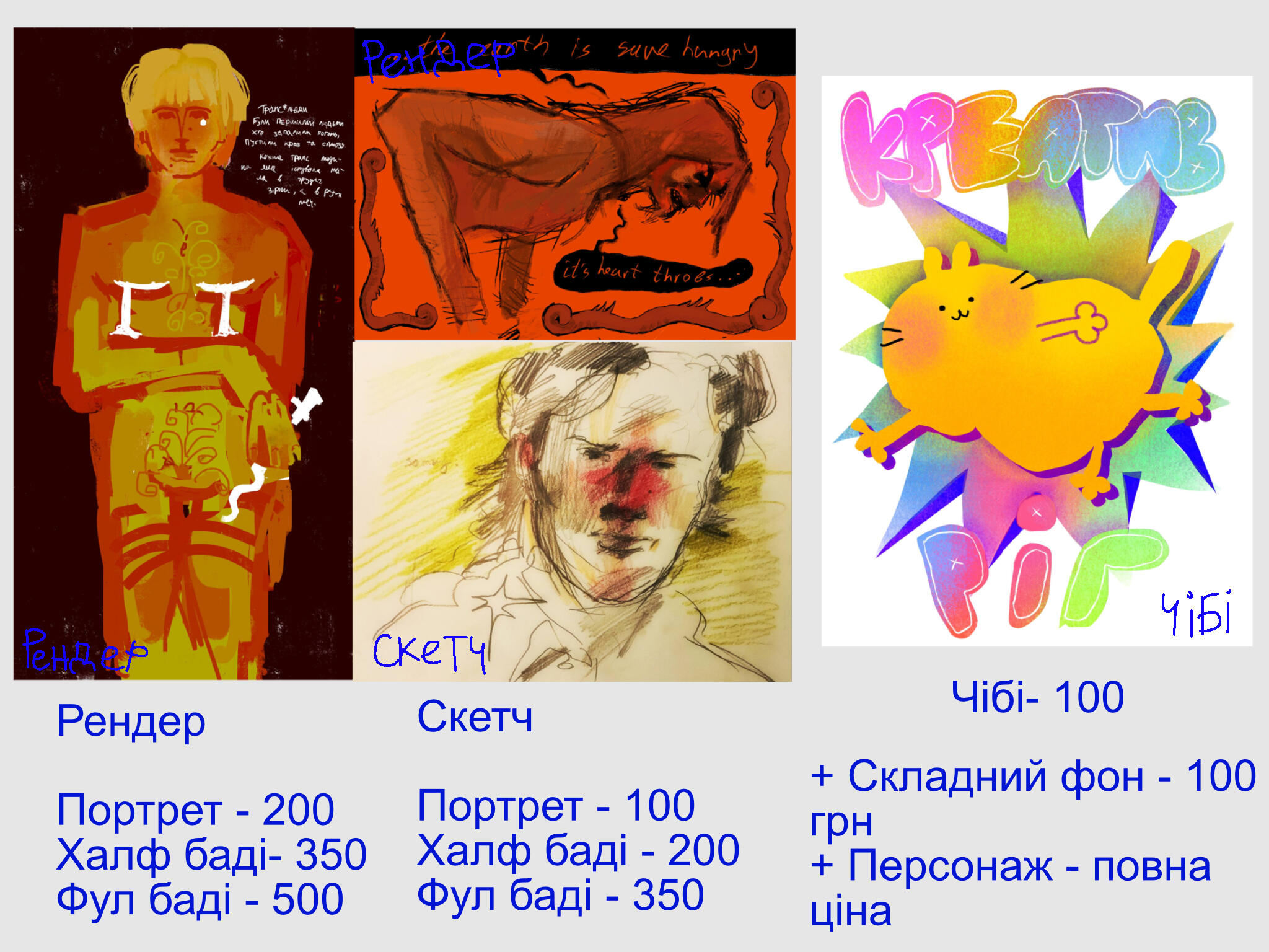 Рендер: портрет 300 / торс 400 / повний зріст 500 грн